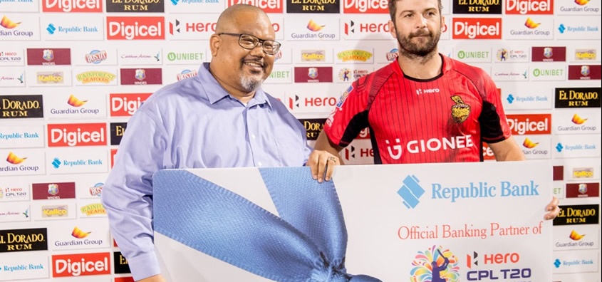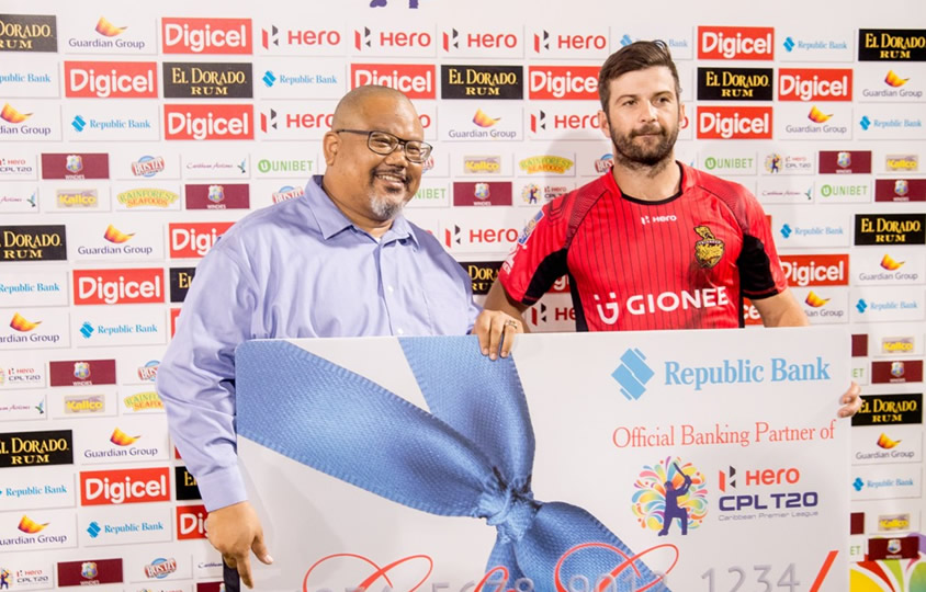 What a catch: Republic Bank’s Executive Director, Derwin Howell, presents the Republic Classic Catch Gift Card, to Trinbago Knight Riders cricketer, Anton Devcich, after last evening’s (Monday 4) game at the Queen’s Park Oval, Port of Spain. Republic Bank Limited is the Official Bank of the Hero Caribbean Premier League (CPL) T20. The competition continues until August 7.