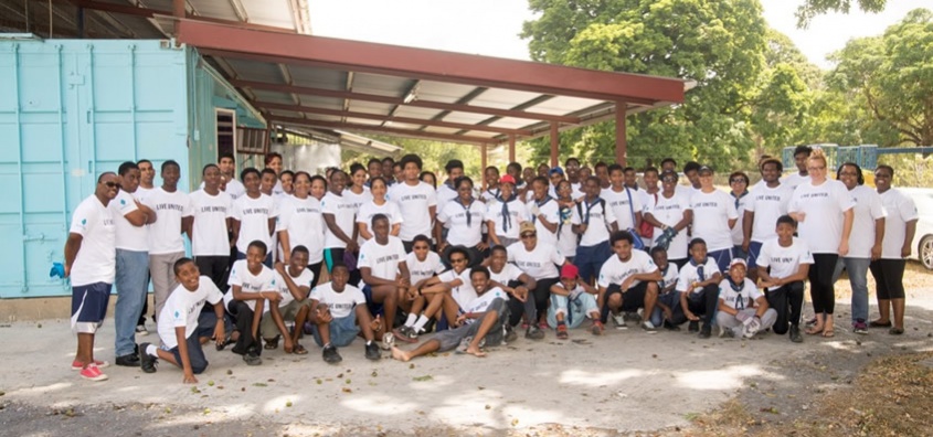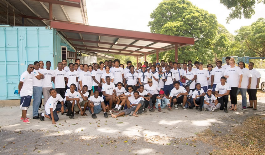 United as One: Republic Bank staff, along with their families, friends and students of QRC, pose for a photo after volunteering their services at the United Way Day of Caring 2015, held last Sunday.