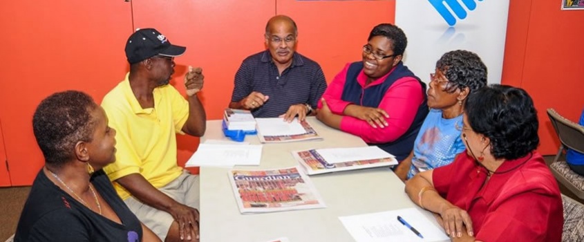 “The Right to Education: Republic Bank’s Social Investment Officer, Nadia Williams (4th from left), participates in a “Reading Circle” at the Adult Literacy Tutors Association (ALTA) headquarters.."
